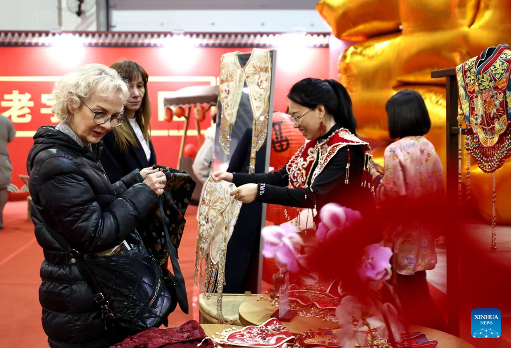 Members of the diplomatic corps know about a "tiger hat" at a festive event for the upcoming Chinese New Year, or the Spring Festival, in Langfang, north China's Hebei Province, Jan. 23, 2025. (Xinhua/Wang Xiao)