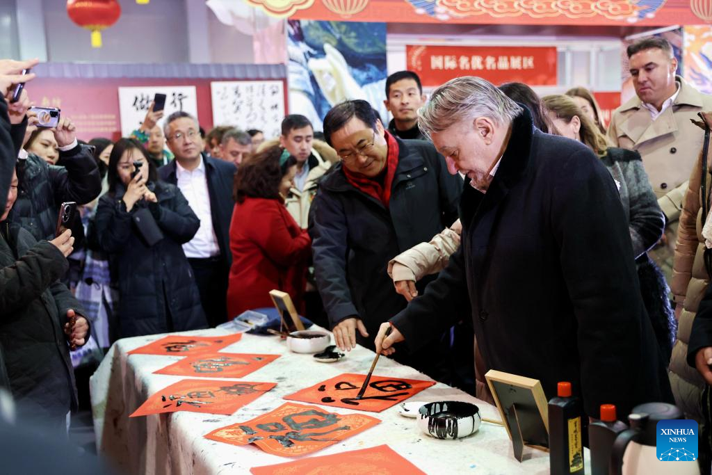 A member of the diplomatic corps experiences Chinese calligraphy at a festive event for the upcoming Chinese New Year, or the Spring Festival, in Langfang, north China's Hebei Province, Jan. 23, 2025. (Xinhua/Wang Xiao)