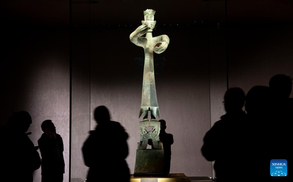 Visitors look at a bronze figure on display in the new building of Sanxingdui Museum in Guanghan City, southwest China's Sichuan Province, Dec. 18, 2024.