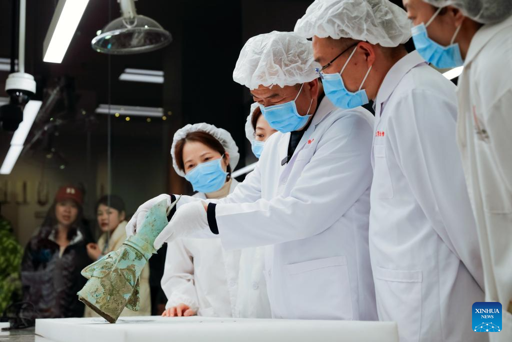 A restorer works in the cultural relics protection and restoration center in the new building of Sanxingdui Museum in Guanghan City, southwest China's Sichuan Province, Dec. 18, 2024.