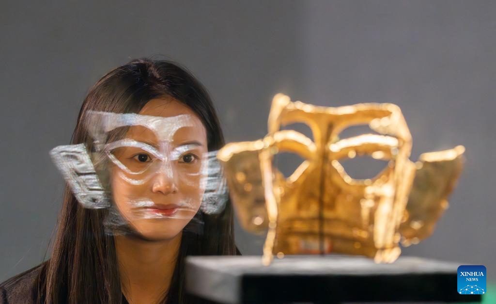 A visitor looks at a golden mask on display in the new building of Sanxingdui Museum in Guanghan City, southwest China's Sichuan Province, Dec. 18, 2024.