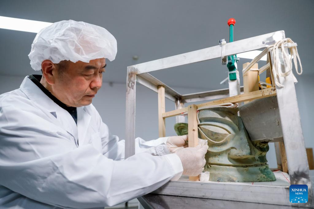 A restorer cleans a bronze mask at Sanxingdui Museum in Guanghan City, southwest China's Sichuan Province, Dec. 18, 2024.