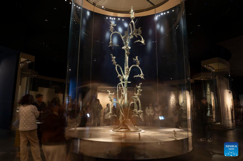 Visitors look at a bronze sacred tree on display in the new building of Sanxingdui Museum in Guanghan City, southwest China's Sichuan Province, Dec. 18, 2024.