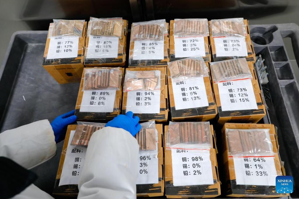 A staff member conducts an experiment on the corrosion of bronze samples with different alloy ratios in soil burial environment at Sanxingdui Museum in Guanghan City, southwest China's Sichuan Province, Dec. 18, 2024.