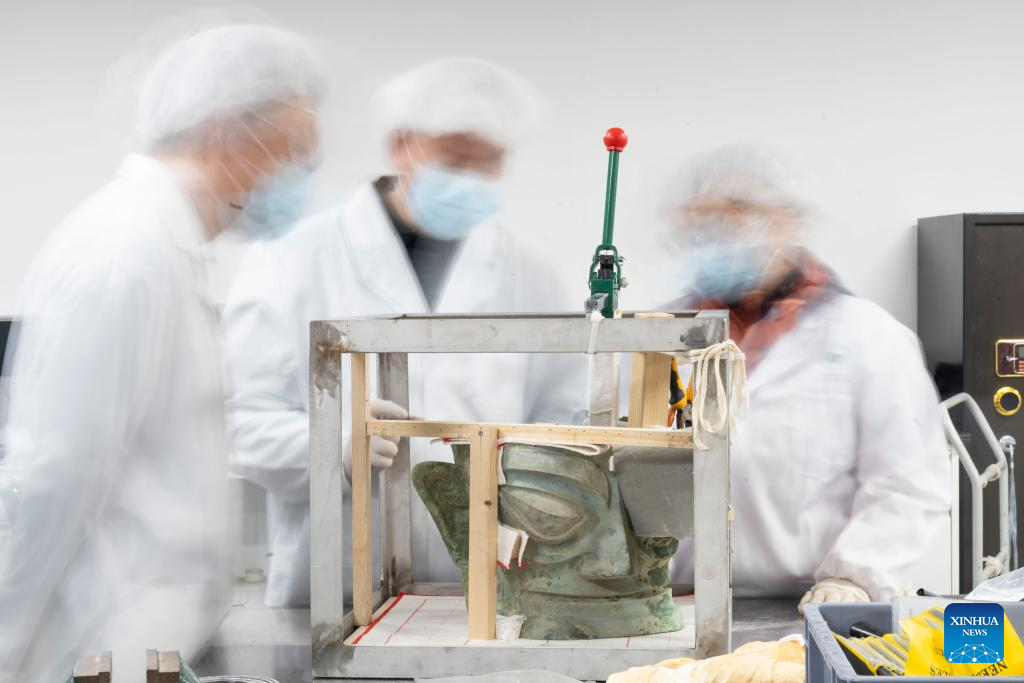 Guo Hanzhong (3rd R) checks a bronze head at Sanxingdui Museum in Guanghan City, southwest China's Sichuan Province, Dec. 18, 2024.