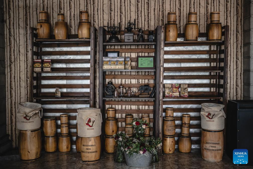 This photo taken on Jan. 8, 2025 shows a shelf at a cafe in Addis Ababa, Ethiopia. As the Spring Festival approaches, many tourists who have just finished their trip in Yunnan choose to take home one or two bags of coffee beans that they roasted themselves. These beans have become a special festive gift this year, whether for friends and family or for personal enjoyment.