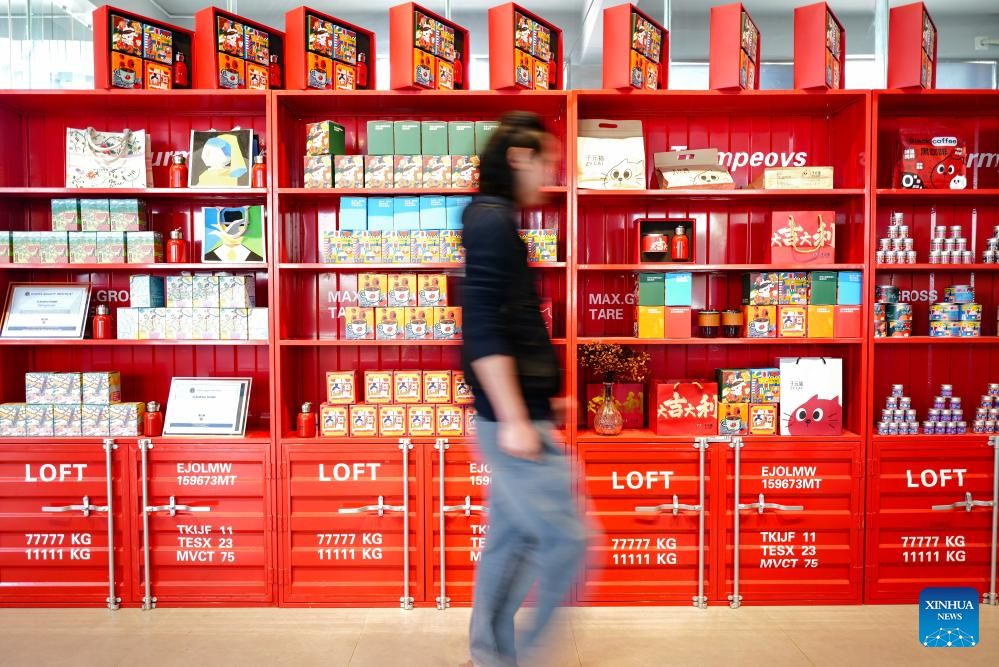 A staff member walks past a shelf displaying coffee products in Pu'er, southwest China's Yunnan Province, Jan. 9, 2025. As the Spring Festival approaches, many tourists who have just finished their trip in Yunnan choose to take home one or two bags of coffee beans that they roasted themselves. These beans have become a special festive gift this year, whether for friends and family or for personal enjoyment.