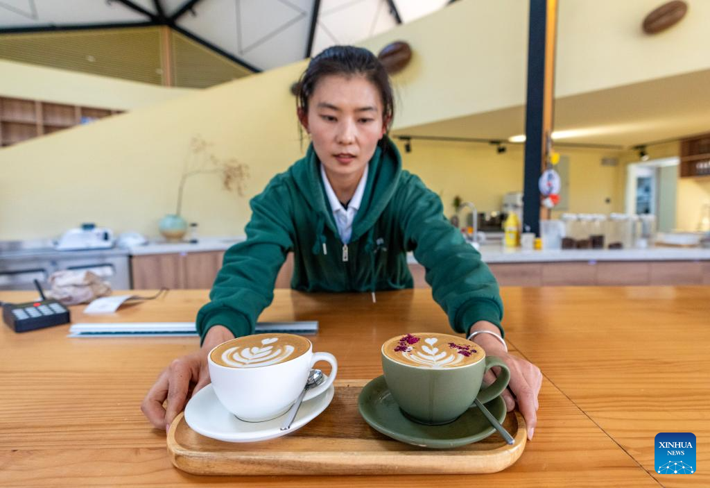 A staff member serves coffees for customers at an experience center in Pu'er, southwest China's Yunnan Province, Jan. 7, 2025. As the Spring Festival approaches, many tourists who have just finished their trip in Yunnan choose to take home one or two bags of coffee beans that they roasted themselves. These beans have become a special festive gift this year, whether for friends and family or for personal enjoyment.