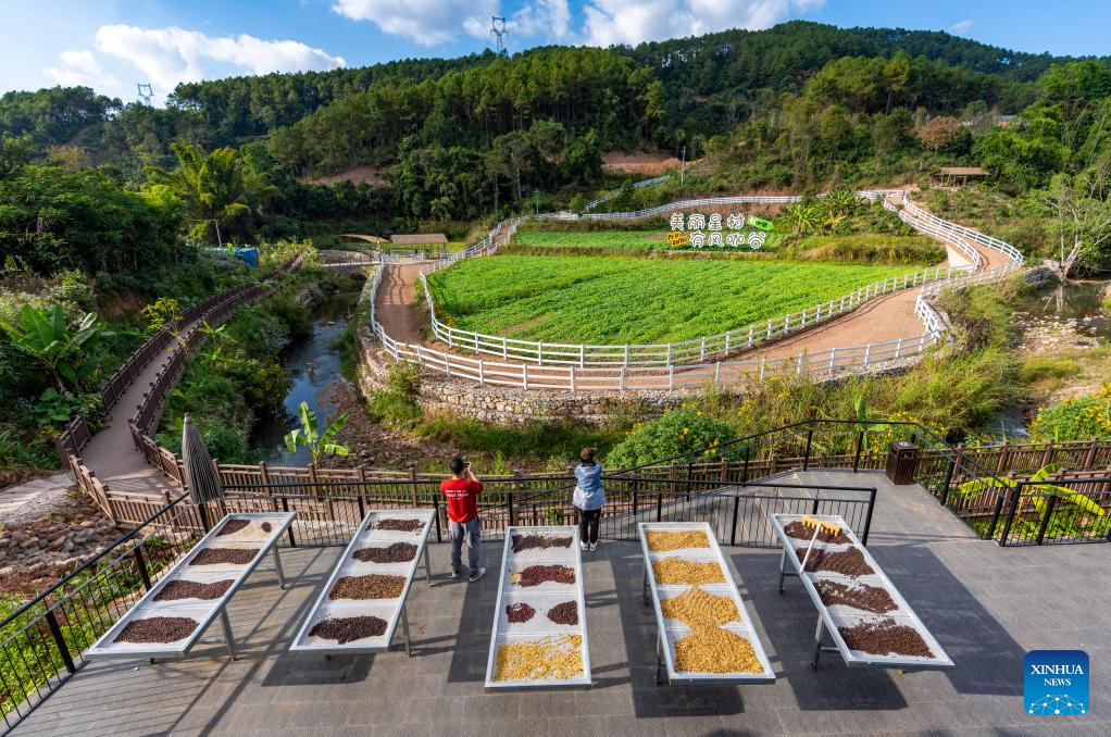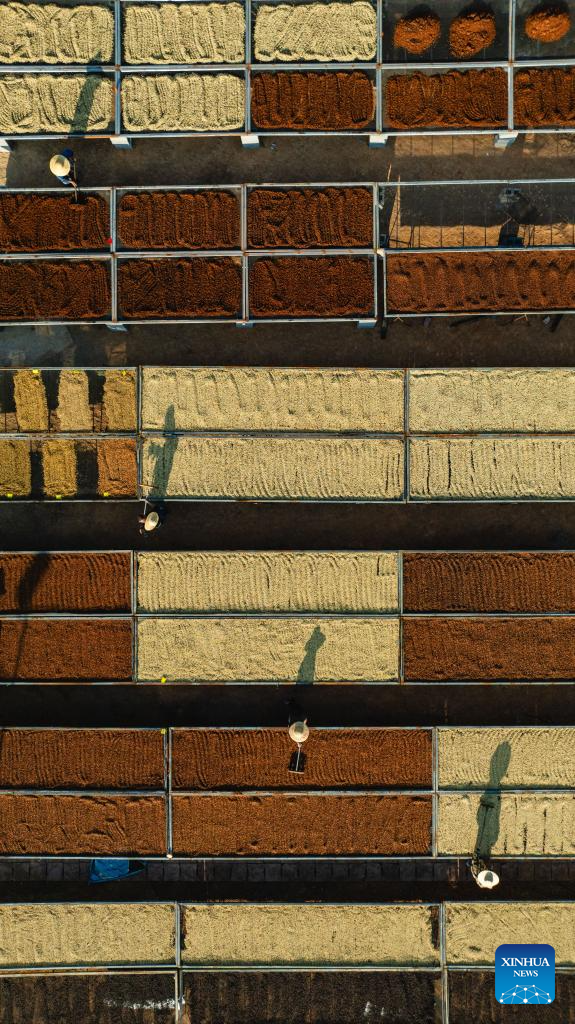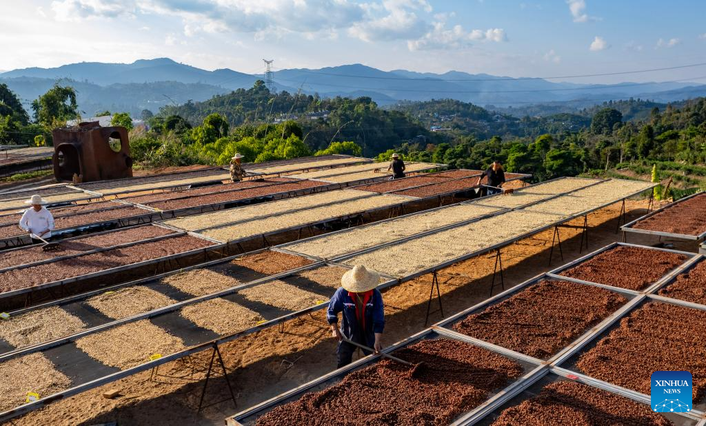 An aerial drone photo taken on Jan. 7, 2025 shows workers drying coffee beans at a coffee manor in Pu'er, southwest China's Yunnan Province. As the Spring Festival approaches, many tourists who have just finished their trip in Yunnan choose to take home one or two bags of coffee beans that they roasted themselves. These beans have become a special festive gift this year, whether for friends and family or for personal enjoyment.