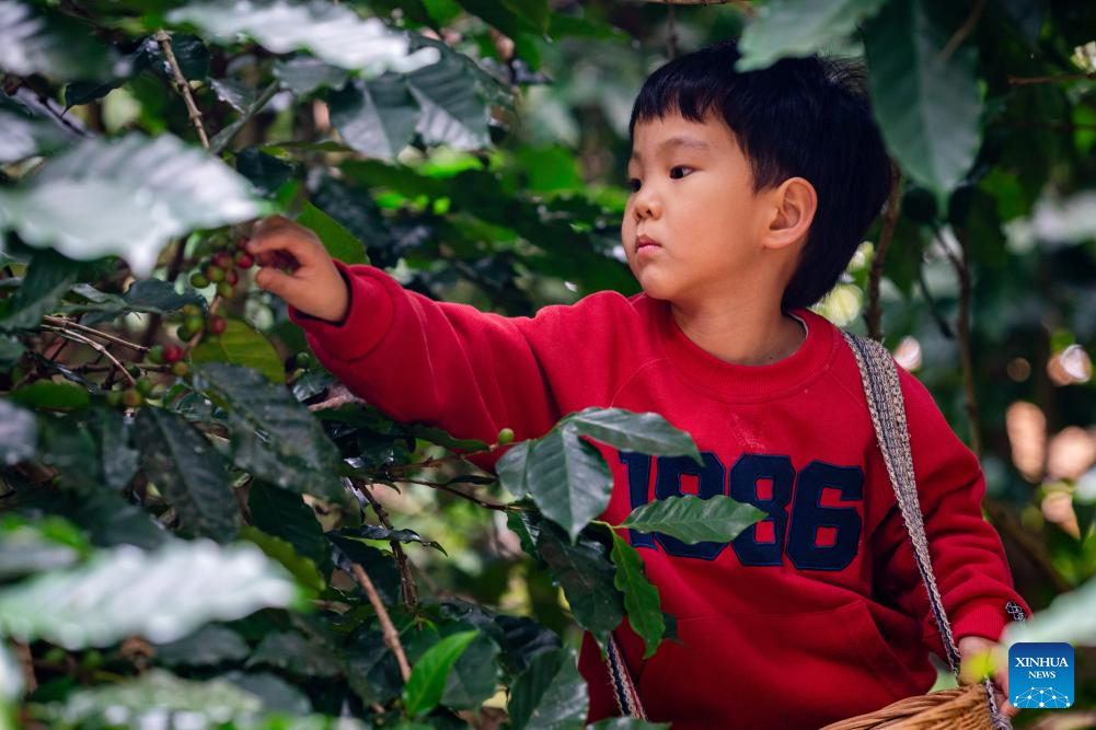A tourist experiences picking coffee fruit at a coffee manor in Pu'er, southwest China's Yunnan Province, Jan. 7, 2025. As the Spring Festival approaches, many tourists who have just finished their trip in Yunnan choose to take home one or two bags of coffee beans that they roasted themselves. These beans have become a special festive gift this year, whether for friends and family or for personal enjoyment.