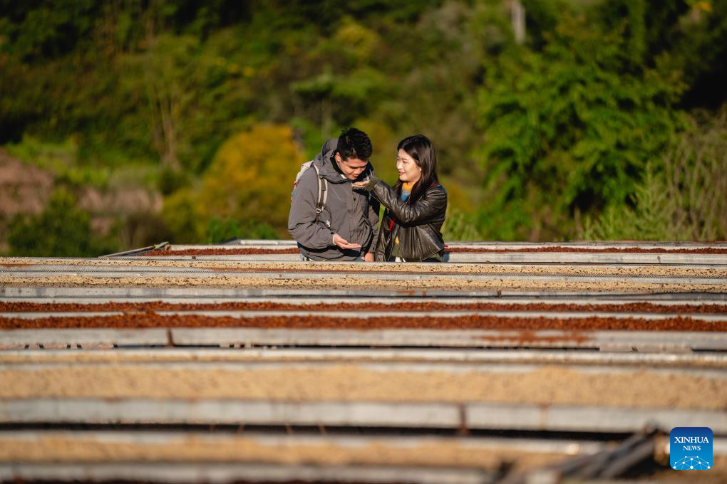 Tourist check coffee beans at a coffee manor in Pu'er, southwest China's Yunnan Province, Jan. 7, 2025. As the Spring Festival approaches, many tourists who have just finished their trip in Yunnan choose to take home one or two bags of coffee beans that they roasted themselves. These beans have become a special festive gift this year, whether for friends and family or for personal enjoyment.