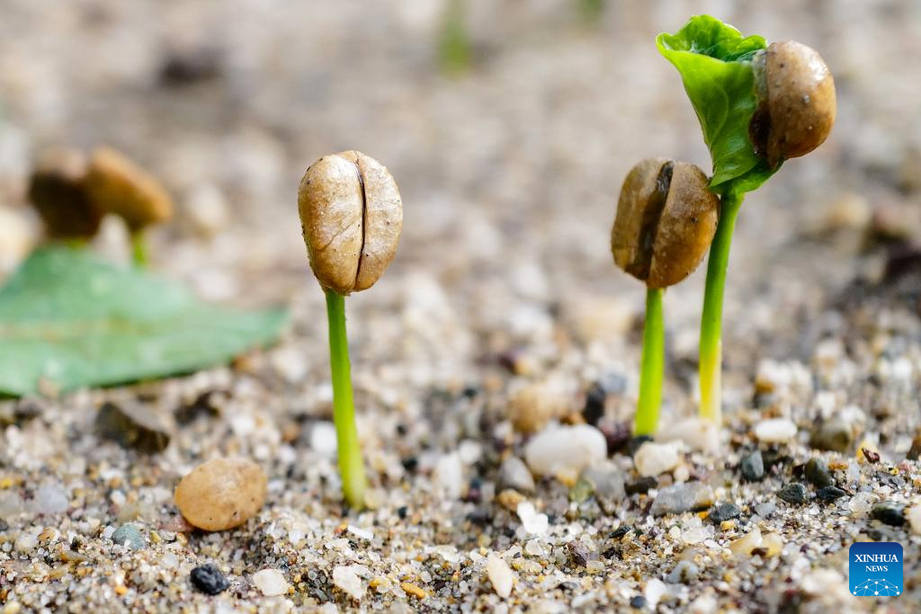 Coffee beans are seen sprouting at a plantation in Pu'er, southwest China's Yunnan Province, Jan. 8, 2025. As the Spring Festival approaches, many tourists who have just finished their trip in Yunnan choose to take home one or two bags of coffee beans that they roasted themselves. These beans have become a special festive gift this year, whether for friends and family or for personal enjoyment.