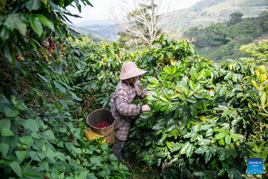 A farmer picks coffee fruit at a coffee manor in Pu'er, southwest China's Yunnan Province, Jan. 8, 2025. As the Spring Festival approaches, many tourists who have just finished their trip in Yunnan choose to take home one or two bags of coffee beans that they roasted themselves. These beans have become a special festive gift this year, whether for friends and family or for personal enjoyment.