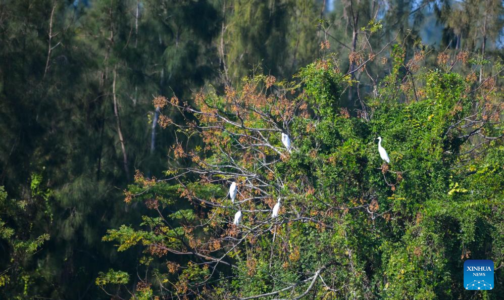 A flock of egrets rest on tree branches at Haiwei wetland in Changjiang Li Autonomous County, south China's Hainan Province, Jan. 23, 2025. As one of the few coastal freshwater swamp wetlands in Hainan Island, the ecosystem and biodiversity of Haiwei wetland are being effectively protected, and it has become an important habitat for migratory birds on the west coast of Hainan Island. (Xinhua/Yang Guanyu)