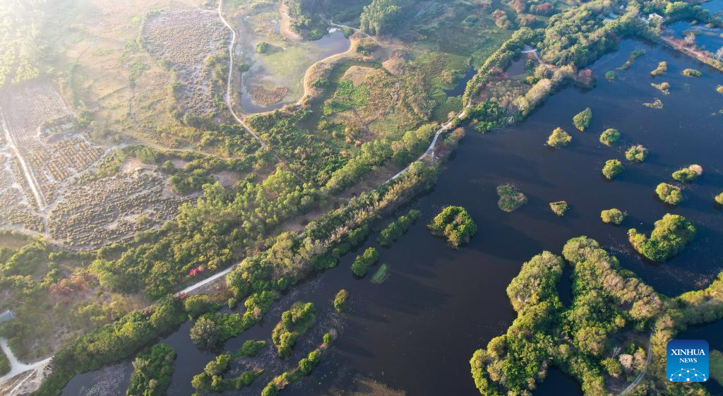 An aerial drone photo taken on Jan. 24, 2025 shows the scenery of Haiwei wetland in Changjiang Li Autonomous County, south China's Hainan Province. As one of the few coastal freshwater swamp wetlands in Hainan Island, the ecosystem and biodiversity of Haiwei wetland are being effectively protected, and it has become an important habitat for migratory birds on the west coast of Hainan Island. (Xinhua/Yang Guanyu)