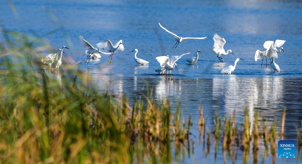 A flock of egrets are pictured at Haiwei wetland in Changjiang Li Autonomous County, south China's Hainan Province, Jan. 24, 2025. As one of the few coastal freshwater swamp wetlands in Hainan Island, the ecosystem and biodiversity of Haiwei wetland are being effectively protected, and it has become an important habitat for migratory birds on the west coast of Hainan Island. (Xinhua/Yang Guanyu)