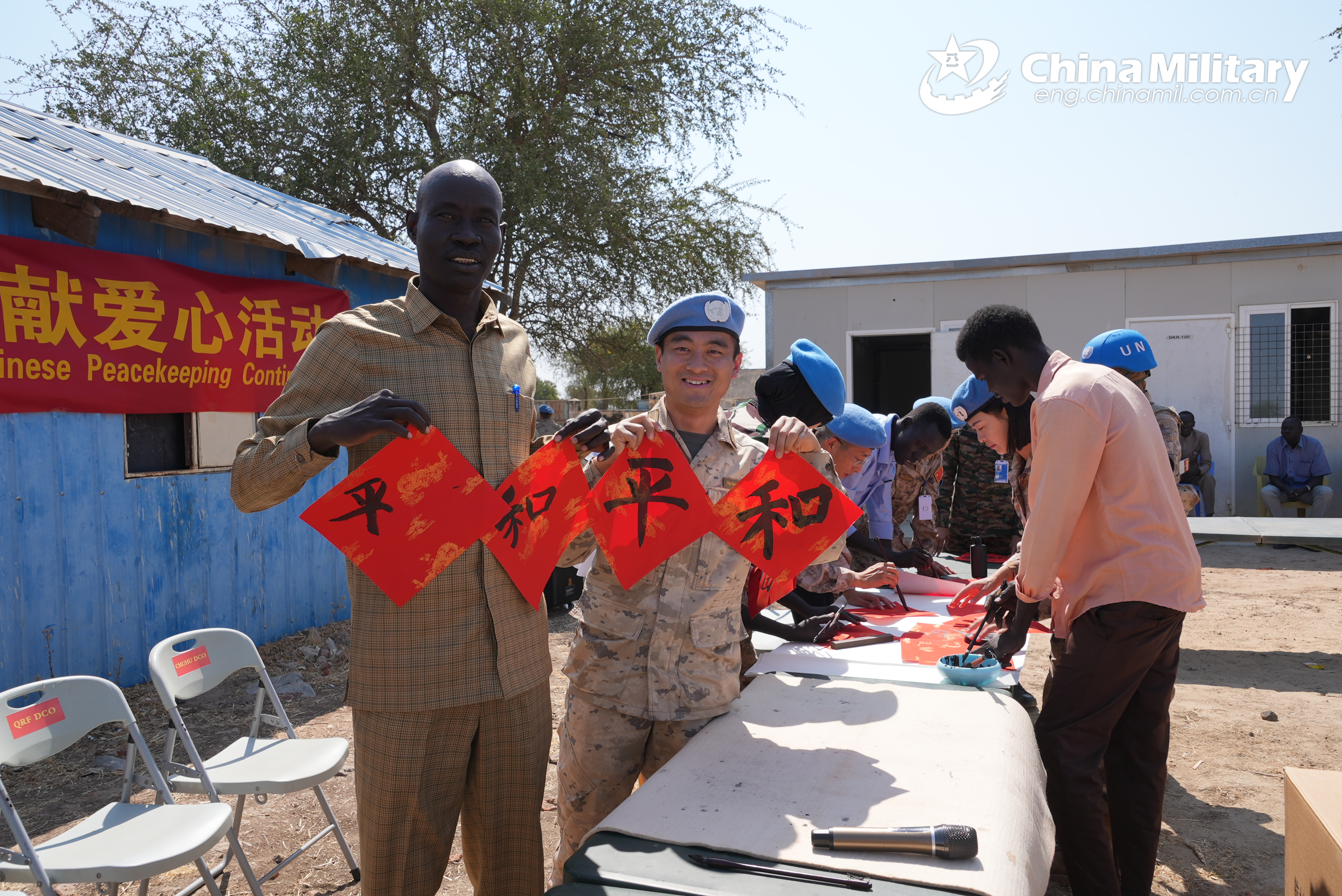 A Chinese peacekeeper and a local student demonstrate Chinese characters "Heping" (meaning "Peace") they write together in a festive activity to celebrate the Spring Festival, Chinese traditional Lunar New Year, which lasts from January 28 to February 4, 2025.