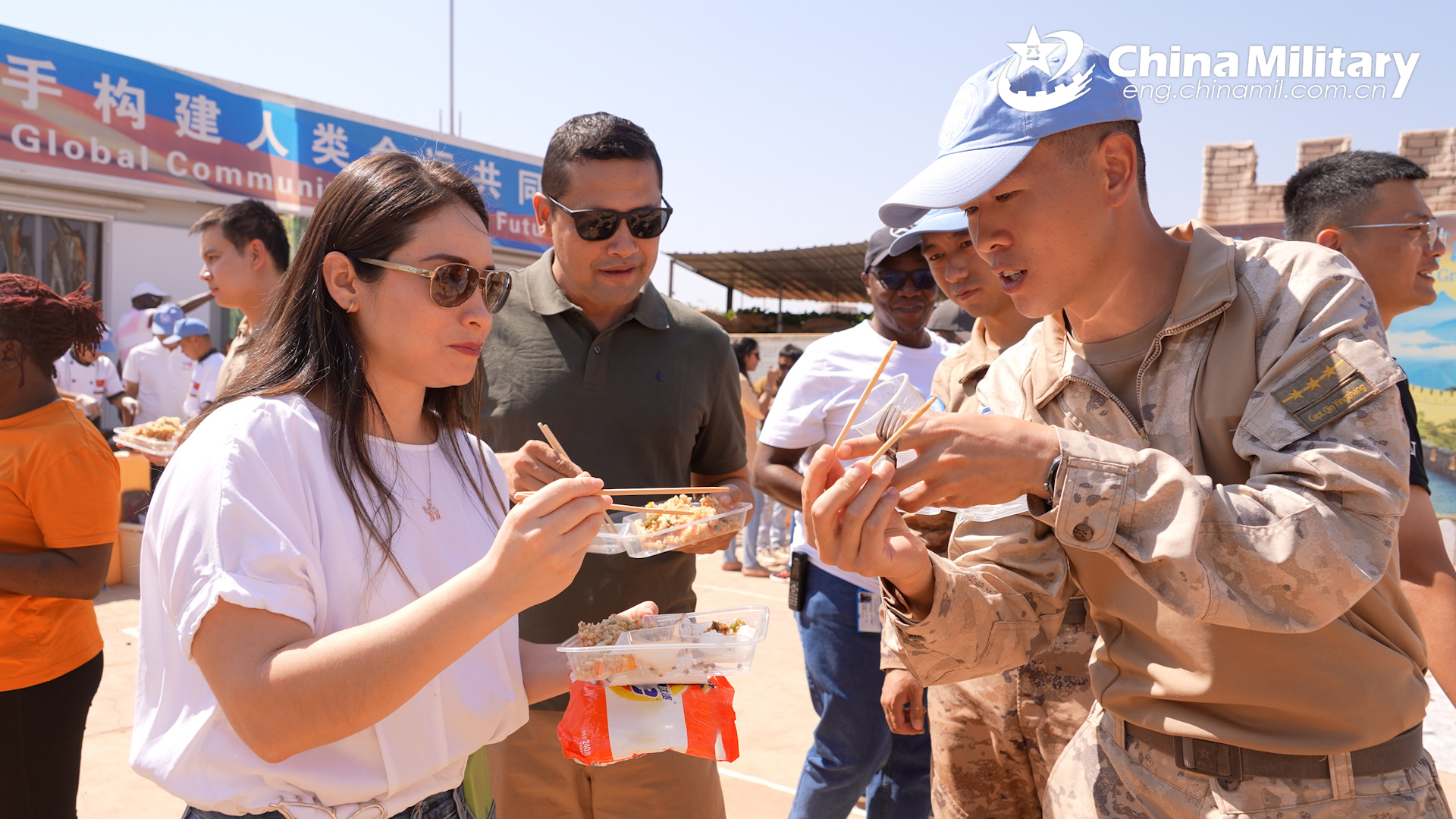 A peacekeeper assigned to the 5th Chinese Peacekeeping Military Utility Helicopter Unit to the United Nations Interim Security Force for Abyei (UNISFA) teaches foreign visitors to use chopsticks in a festive activity to celebrate the Spring Festival, Chinese traditional Lunar New Year, which lasts from January 28 to February 4, 2025.