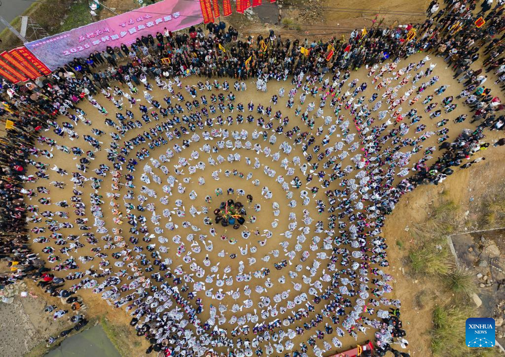 An aerial drone photo taken on Feb. 5, 2025 shows people of different ethnic groups performing traditional dancing during the "Bainiaoyi" Lusheng festival in Gandong Township, Rongshui Miao Autonomous County of Liuzhou, south China's Guangxi Zhuang Autonomous Region. During "Bainiaoyi" Lusheng festival, a traditional festival annually held in Gandong Township, people of different ethnic groups gather together to demonstrate traditional ethnic attire, blow Lusheng, a traditional reed-pipe wind instrument, and perform traditional dancing. (Photo by Ou Mingxi/Xinhua)