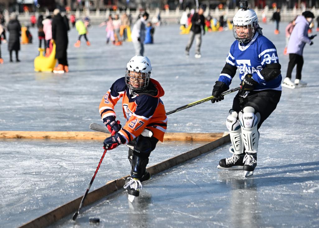 A child practices ice hockey on the frozen Shichahai Lake in Beijing, capital of China, Jan. 19, 2025. (Xinhua/Zhang Chenlin)
