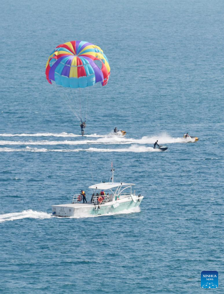 Tourists have fun at the Dadonghai scenic area in Sanya, south China's Hainan Province, Feb. 6, 2025. Sanya received over 2.56 million tourists during the 8-day Spring Festival holiday, generating 6.7 billion yuan (about 920 million U.S. dollars) in tourism revenue. (Xinhua/Zhao Yingquan)
