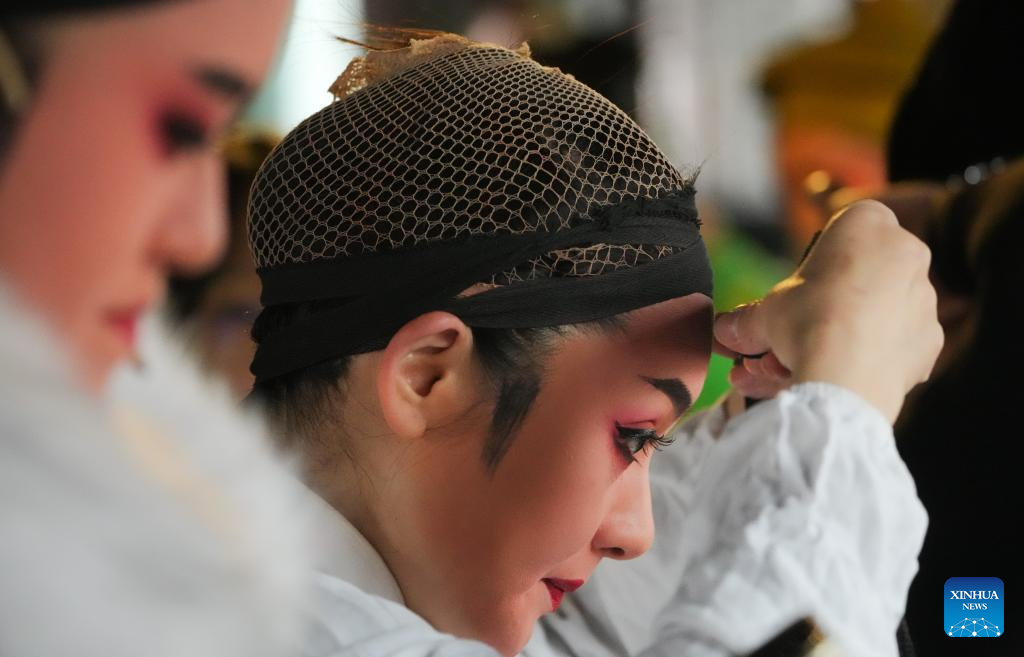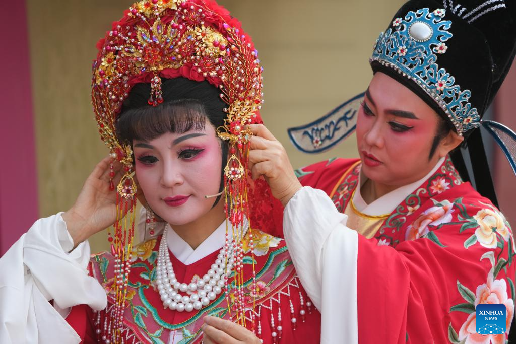 Artists prepare to perform Shaoxing Opera during an opera gala in Qiaoli Village of Shengzhou, east China's Zhejiang Province, Jan. 21, 2025. Shaoxing opera, also known as Yue opera, emerged in the early 1900s in east China's Zhejiang Province. Around the Spring Festival, opera troupes are busy performing at theaters, cultural halls, and temple fairs, creating a vibrant and festive atmosphere.