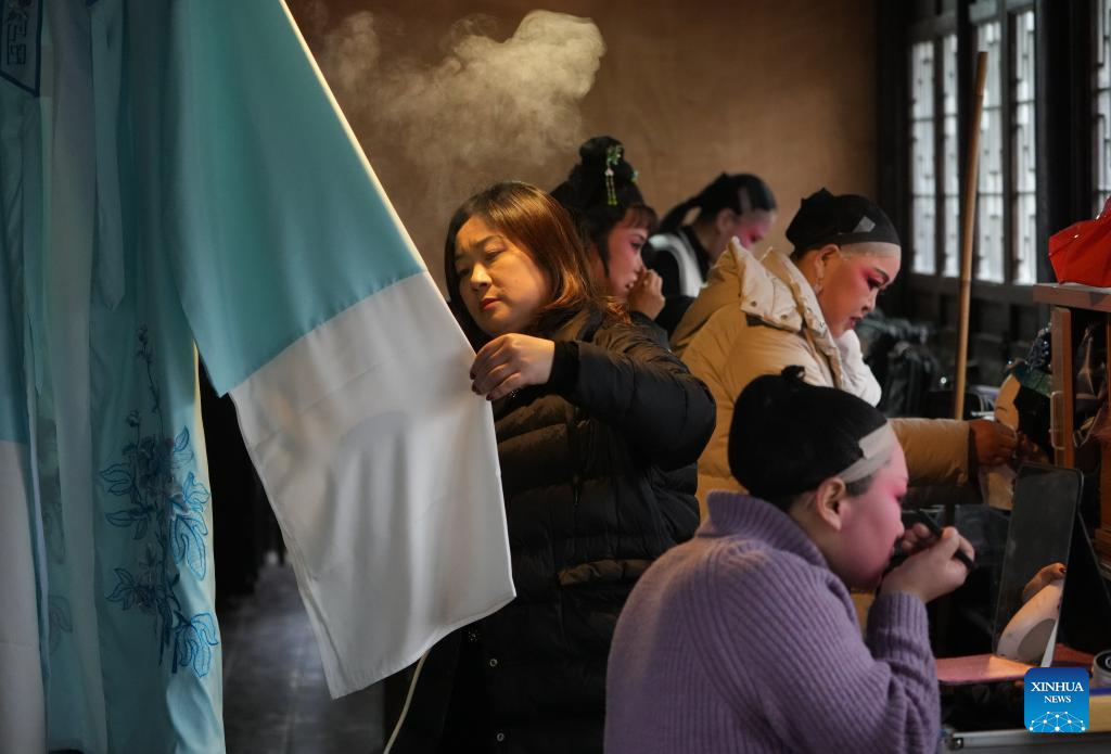 Artists prepare to perform Shaoxing Opera at a cultural hall in Qingshuitang Village of Shengzhou, east China's Zhejiang Province, Jan. 21, 2025. Shaoxing opera, also known as Yue opera, emerged in the early 1900s in east China's Zhejiang Province. Around the Spring Festival, opera troupes are busy performing at theaters, cultural halls, and temple fairs, creating a vibrant and festive atmosphere.