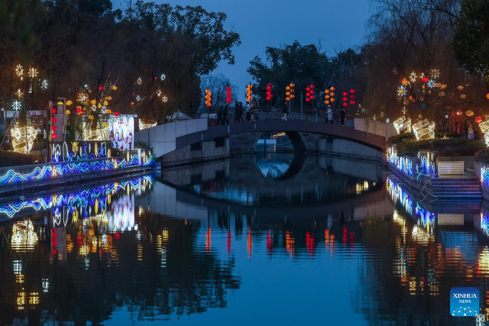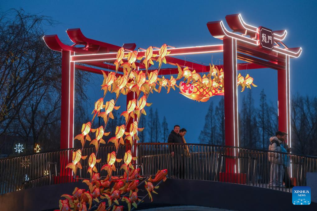 People look at festive lanterns in Nanhu District of Jiaxing, east China's Zhejiang Province, Feb. 6, 2025. Festive preparations are underway in Nanhu District of Jiaxing for the upcoming Lantern Festival. (Xinhua/Xu Yu)