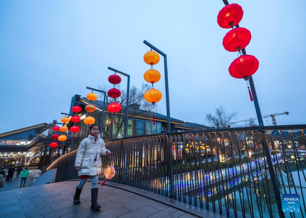 A girl holding a lantern walks on a bridge in Nanhu District of Jiaxing, east China's Zhejiang Province, Feb. 6, 2025. Festive preparations are underway in Nanhu District of Jiaxing for the upcoming Lantern Festival. (Xinhua/Xu Yu)
