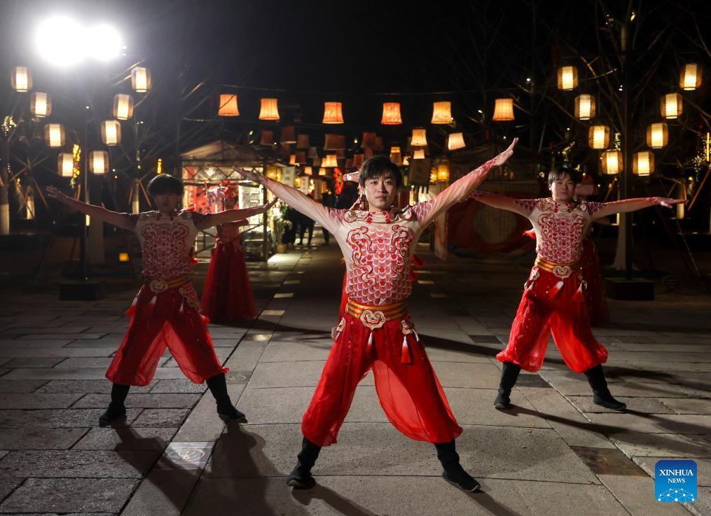 Actors perform at a park in Nanhu District of Jiaxing, east China's Zhejiang Province, Feb. 6, 2025. Festive preparations are underway in Nanhu District of Jiaxing for the upcoming Lantern Festival. (Xinhua/Xu Yu)