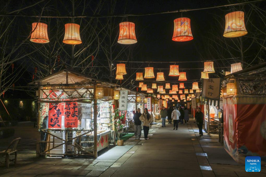 An intangible cultural heritage market is pictured at a park in Nanhu District of Jiaxing, east China's Zhejiang Province, Feb. 6, 2025. Festive preparations are underway in Nanhu District of Jiaxing for the upcoming Lantern Festival. (Xinhua/Xu Yu)