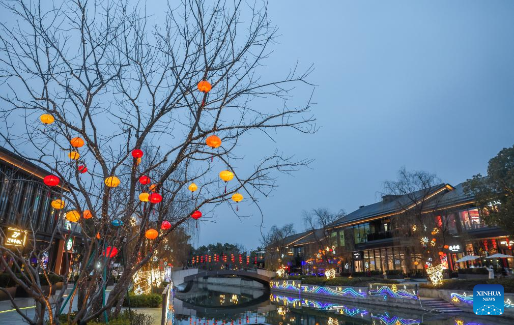 Festive lanterns are pictured in Nanhu District of Jiaxing, east China's Zhejiang Province, Feb. 6, 2025. Festive preparations are underway in Nanhu District of Jiaxing for the upcoming Lantern Festival. (Xinhua/Xu Yu)
