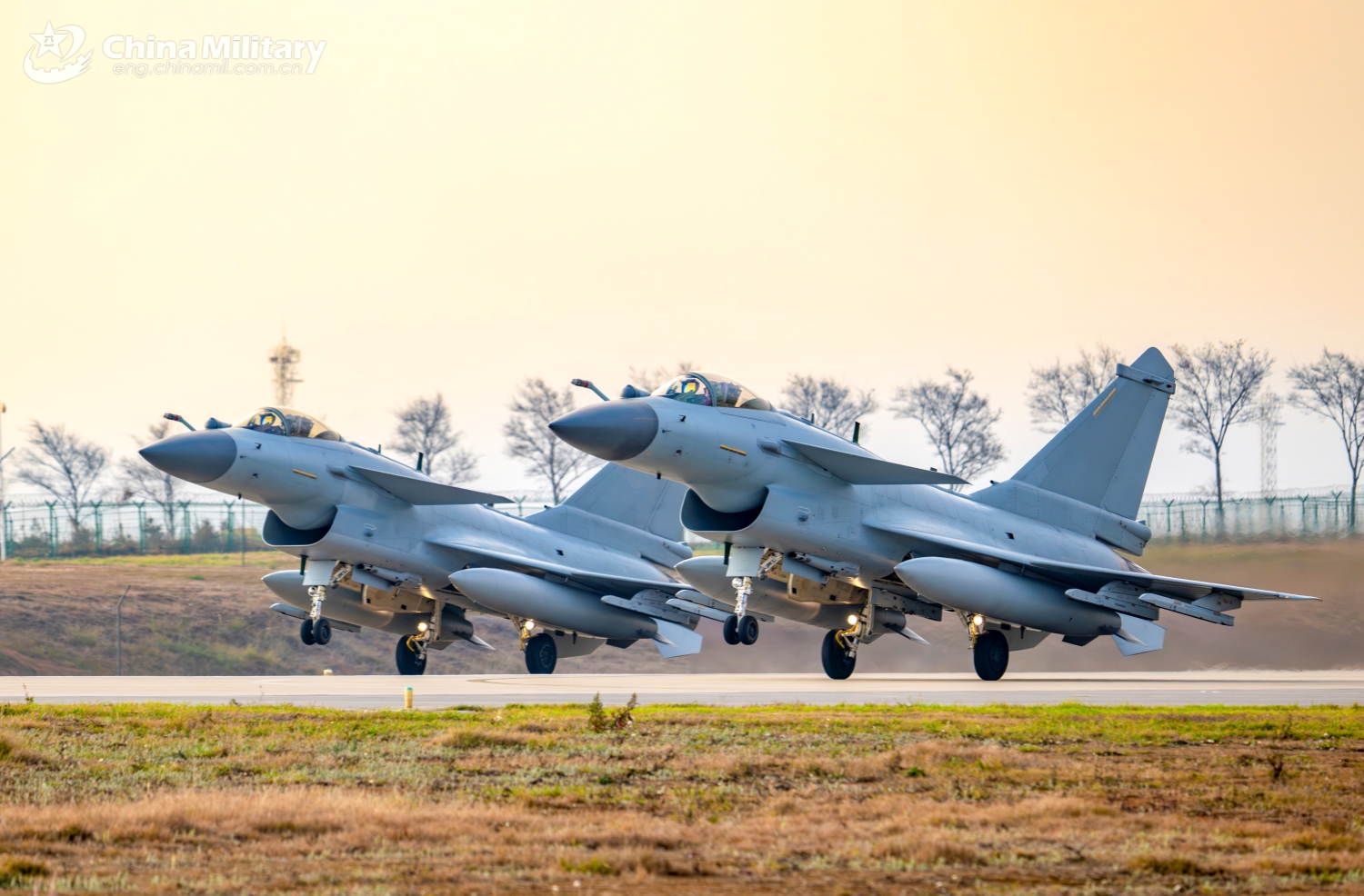 Two J-10C fighter jets attached to an aviation brigade with the air force under the Chinese PLA Southern Theater Command take off in formation during a flight training exercise in early January, 2025. (eng.chinamil.com.cn/Photo by Xiao Rui)