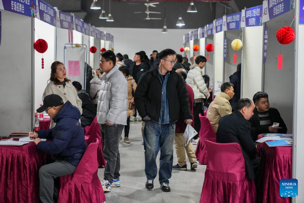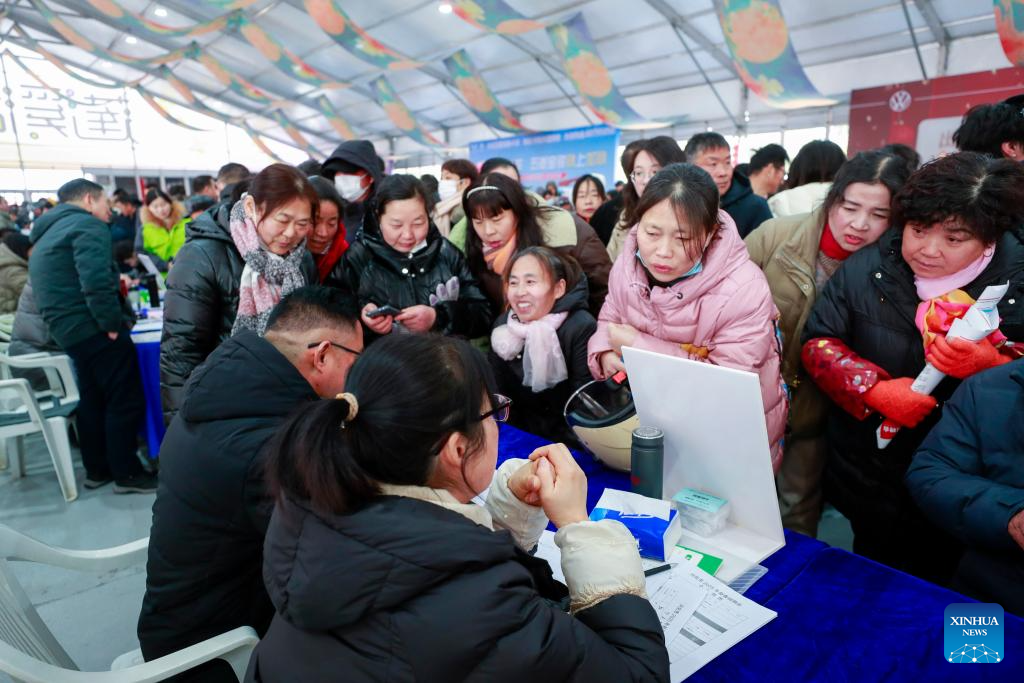 Job seekers attend a job fair in Xinghua City, east China's Jiangsu Province, Feb. 7, 2025. As the Spring Festival holiday ended, a variety of job fairs are held across the country. (Photo by Zhou Shegen/Xinhua)