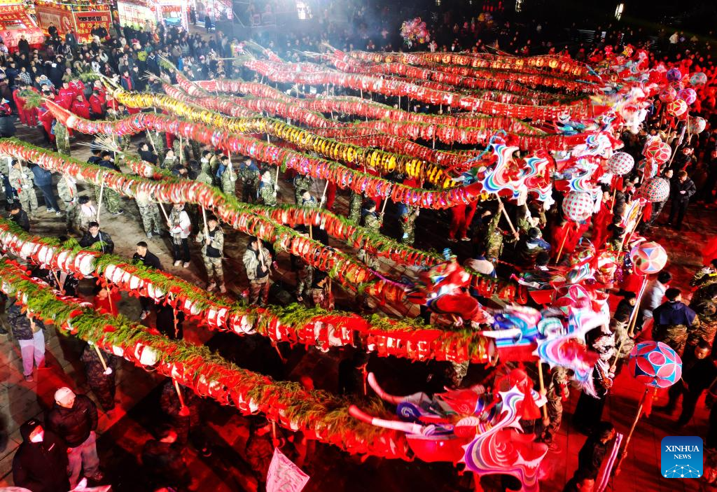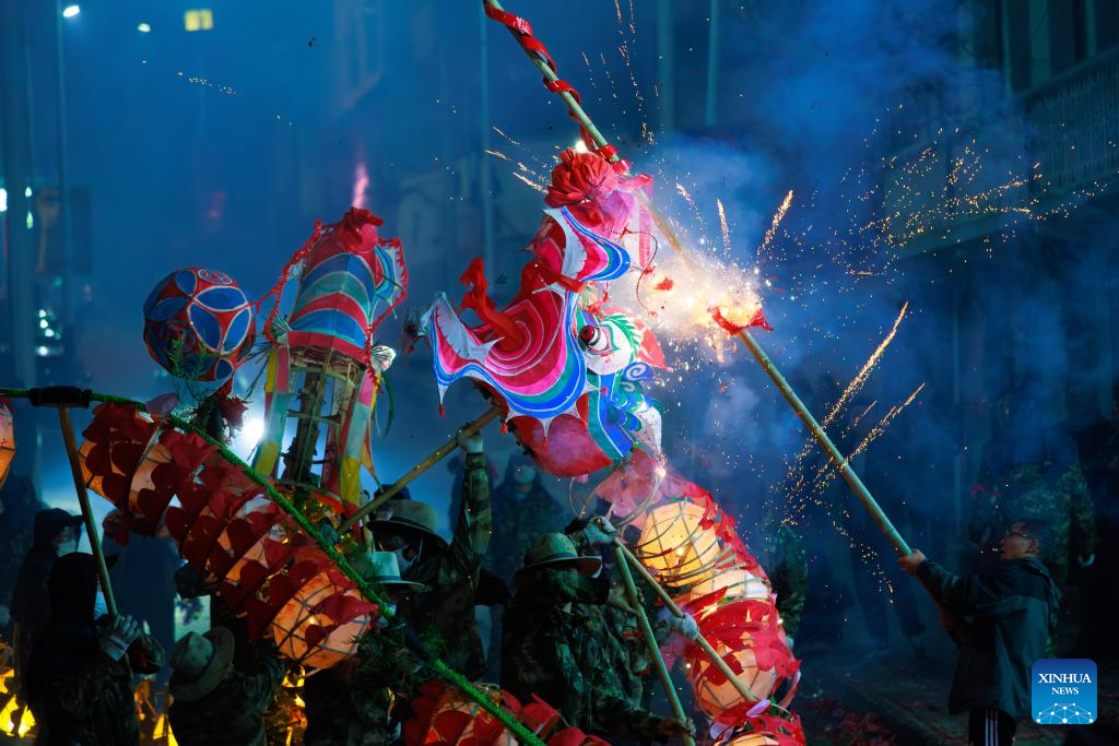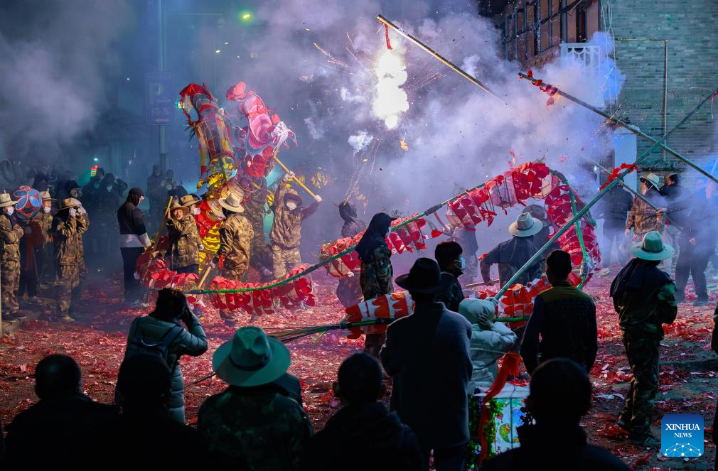 Dragon dancers perform in Shibing County of Qiandongnan Miao and Dong Autonomous Prefecture, southwest China's Guizhou Province, Feb. 6, 2025. "Shibing dragon lantern", a provincial intangible cultural heritage in Guizhou, is a festive dragon lantern dance in Shibing County and featured by the fantastic performance amid fireworks. In recent years, the dragon lantern parade has become a cultural icon of Shibing, attracting numerous tourists during holidays. (Xinhua/Liu Xu)