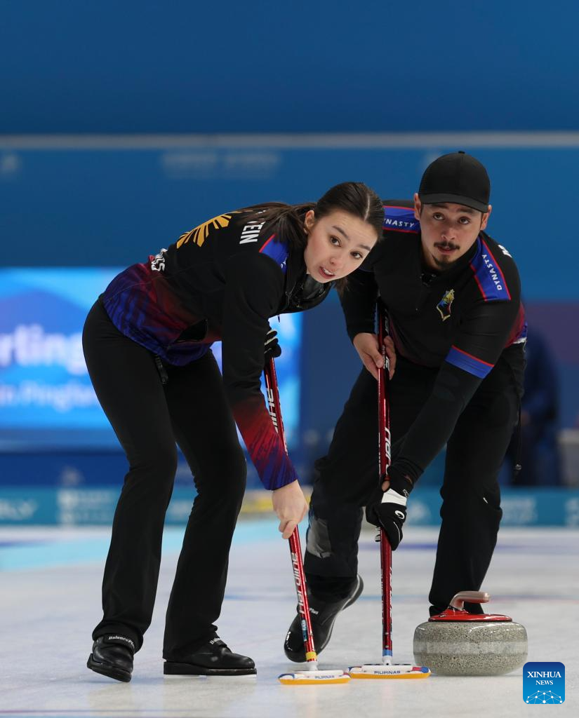 Kathleen Sumbillo Dubberstein (L)/Marc Pfister of the Philippines compete during the mixed doubles bronze medal match of the curling event between Han Yu/Wang Zhiyu of China and Kathleen Sumbillo Dubberstein/Marc Pfister of the Philippines at the 9th Asian Winter Games in Harbin, northeast China's Heilongjiang Province, Feb. 8, 2025. (Xinhua/Hu Xingyu)