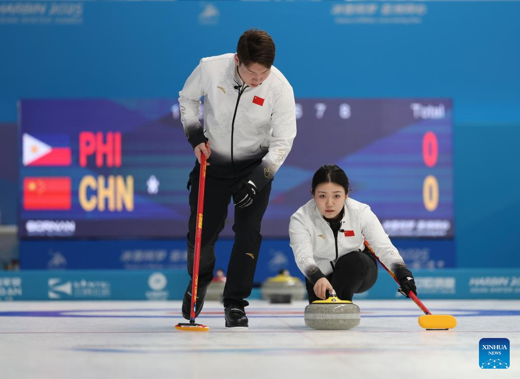 Han Yu (R) and Wang Zhiyu of China compete during the mixed doubles bronze medal match of the curling event between Han Yu/Wang Zhiyu of China and Kathleen Sumbillo Dubberstein/Marc Pfister of the Philippines at the 9th Asian Winter Games in Harbin, northeast China's Heilongjiang Province, Feb. 8, 2025. (Xinhua/Hu Xingyu)
