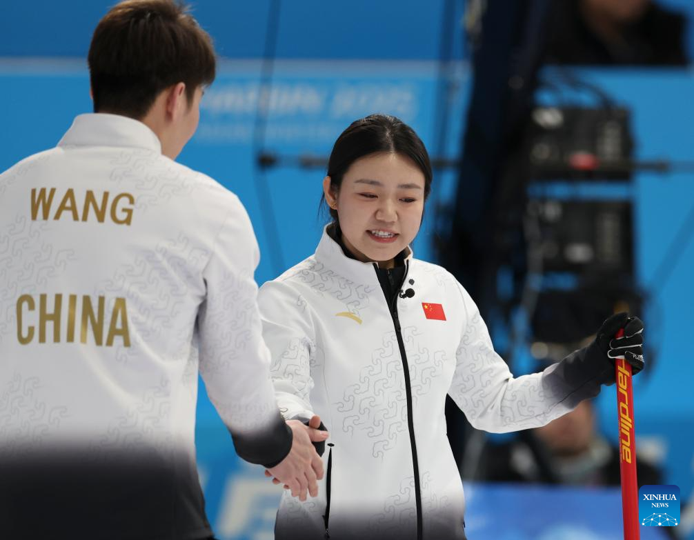 Han Yu (R) and Wang Zhiyu of China clap hands during the mixed doubles bronze medal match of the curling event between Han Yu/Wang Zhiyu of China and Kathleen Sumbillo Dubberstein/Marc Pfister of the Philippines at the 9th Asian Winter Games in Harbin, northeast China's Heilongjiang Province, Feb. 8, 2025. (Xinhua/Hu Xingyu)