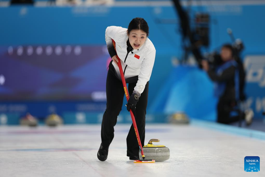 Han Yu of China competes during the mixed doubles bronze medal match of the curling event between Han Yu/Wang Zhiyu of China and Kathleen Sumbillo Dubberstein/Marc Pfister of the Philippines at the 9th Asian Winter Games in Harbin, northeast China's Heilongjiang Province, Feb. 8, 2025. (Xinhua/Hu Xingyu)