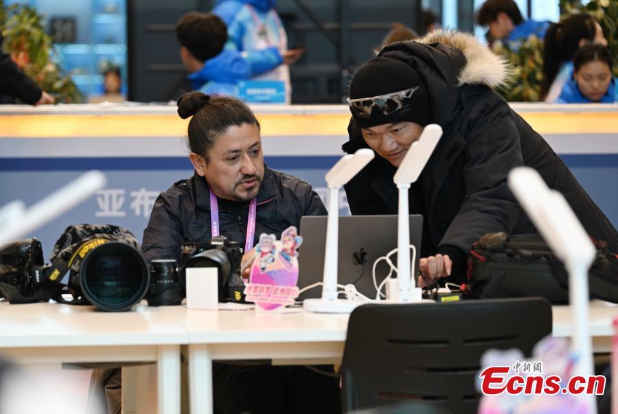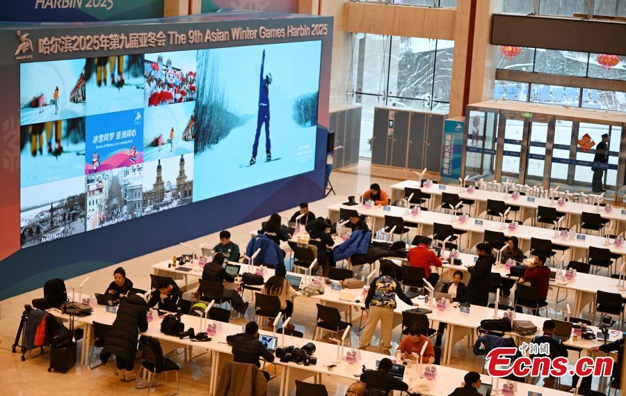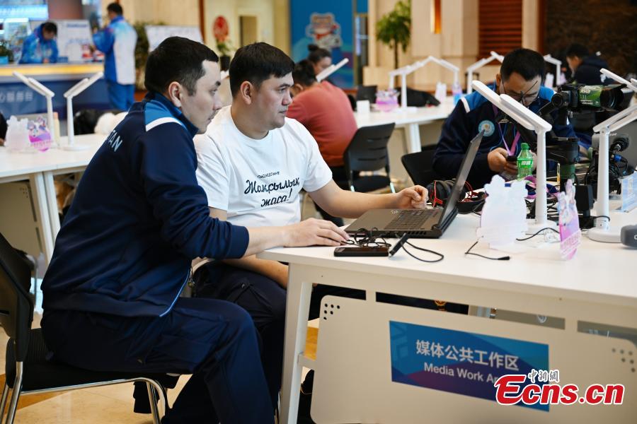 Journalists work at the media center for the 9th Asian Winter Games at Yabuli Ski Resort, northeast China's Heilongjiang Province, Feb. 7, 2025. (China News Service/Liu Wenhua)