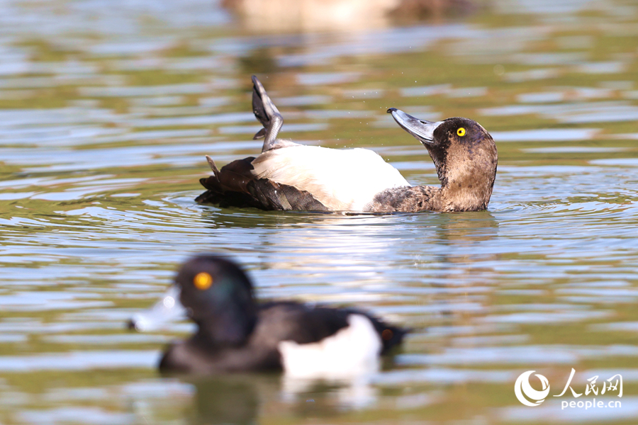 A photo shows a tufted duck flipped onto its back as it floats on the water and basks in the sunlight. (People's Daily Online/Chen Bo)