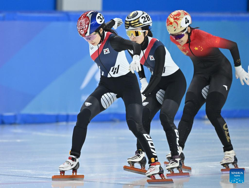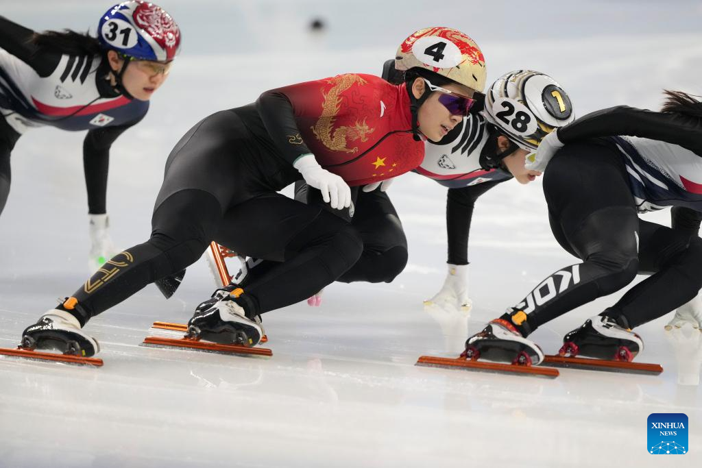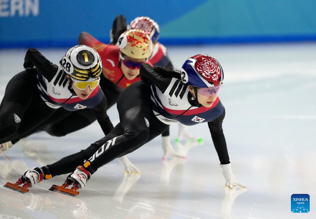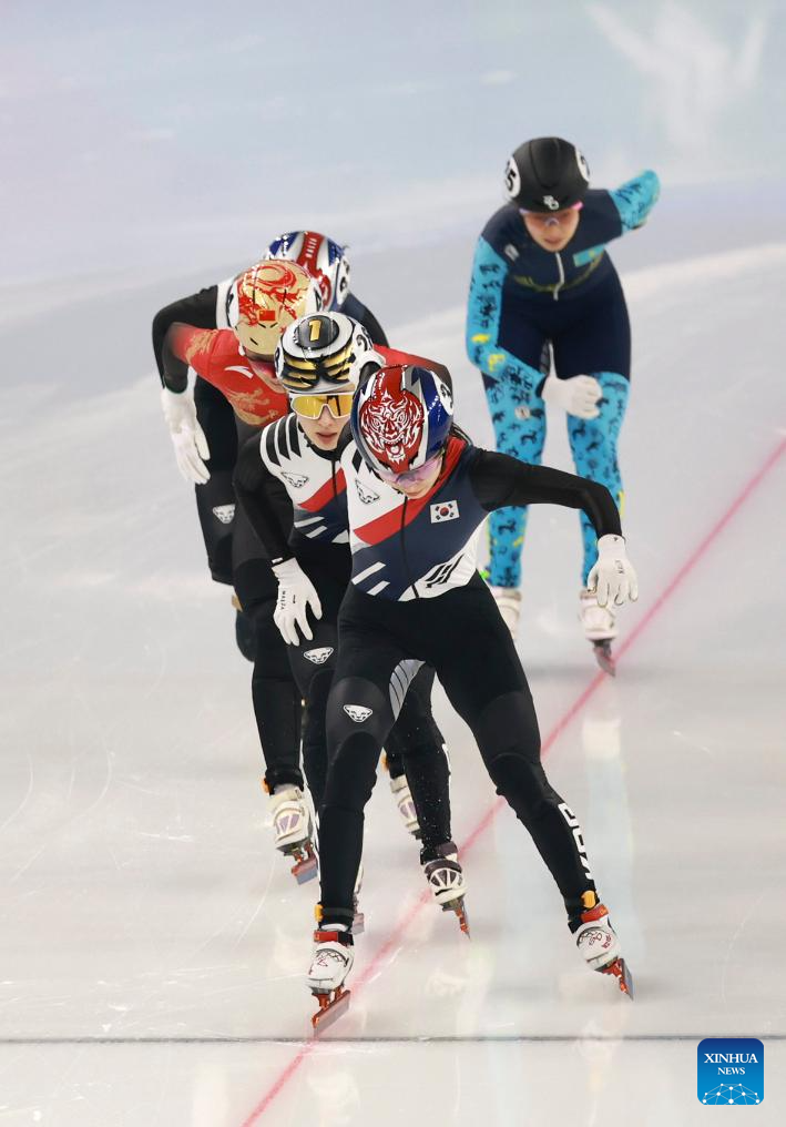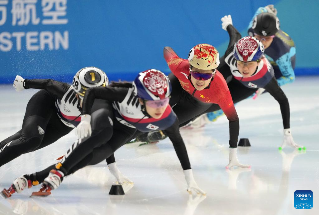(from L to R) Kim Gilli, Choi Minjeong of South Korea, Zhang Chutong of China, Shim Sukhee of South Korea and Malika Yermek of Kazakhstan compete during the women's 1000m final match of the short track speed skating event at the 9th Asian Winter Games in Harbin, northeast China's Heilongjiang Province, Feb. 9, 2025. (Xinhua/Yan Linyun)