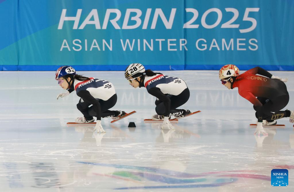 Kim Gilli (L, front), Choi Minjeong (C, front) and Shim Sukhee (R, front) of South Korea compete during the women's 1000m final match of the short track speed skating event at the 9th Asian Winter Games in Harbin, northeast China's Heilongjiang Province, Feb. 9, 2025. (Xinhua/Yan Linyun)