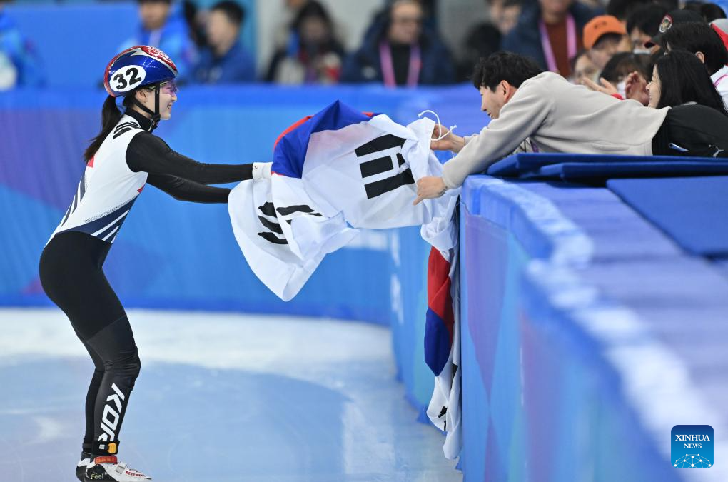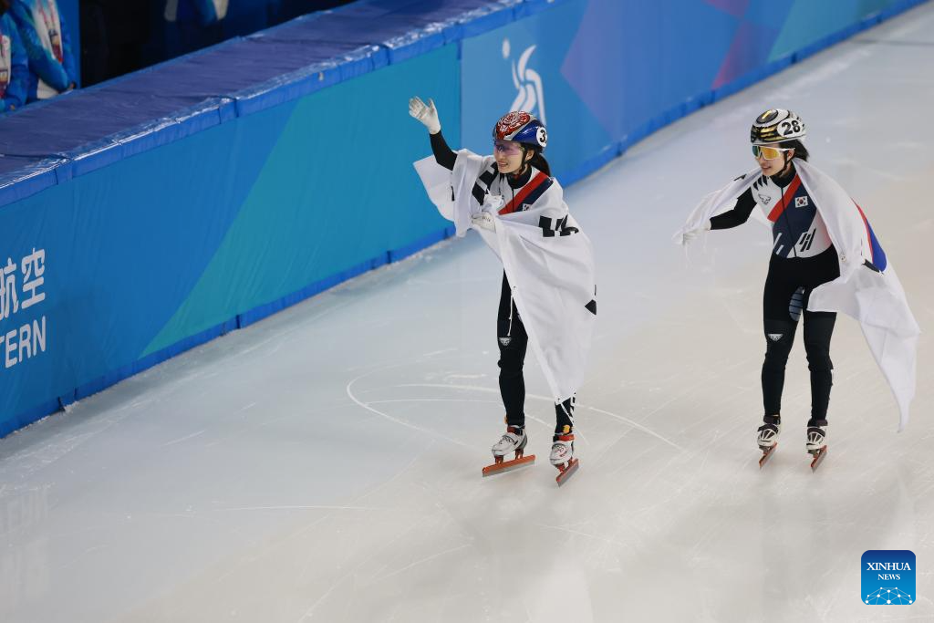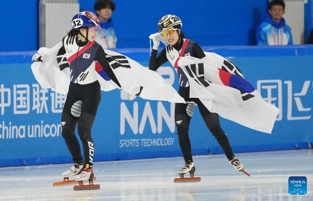 Choi Minjeong (L) of South Korea celebrates after the women's 1000m final match of the short track speed skating event at the 9th Asian Winter Games in Harbin, northeast China's Heilongjiang Province, Feb. 9, 2025. (Xinhua/Jiang Han)