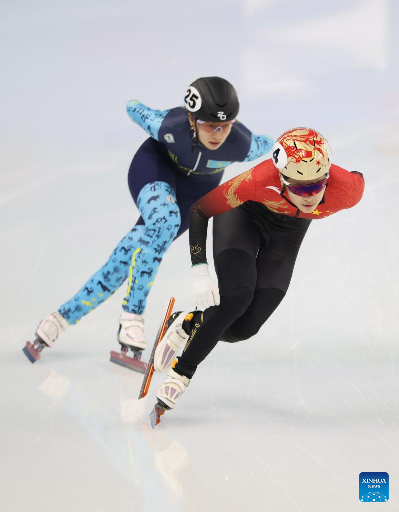 Zhang Chutong (R) of China and Malika Yermek of Kazakhstan compete during the women's 1000m final match of the short track speed skating event at the 9th Asian Winter Games in Harbin, northeast China's Heilongjiang Province, Feb. 9, 2025. (Xinhua/Zhang Tao)