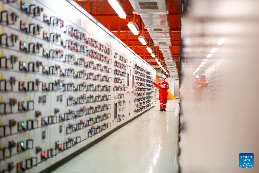A worker checks the power supply system at an offshore production platform of the first phase of Bozhong 26-6 oilfield in China's Bohai Sea, Feb. 8, 2025. The first phase of Bozhong 26-6 oilfield, by far the largest metamorphic rock oilfield in the world, commenced production on Friday, according to its developer, the China National Offshore Oil Corporation (CNOOC) Tianjin branch.