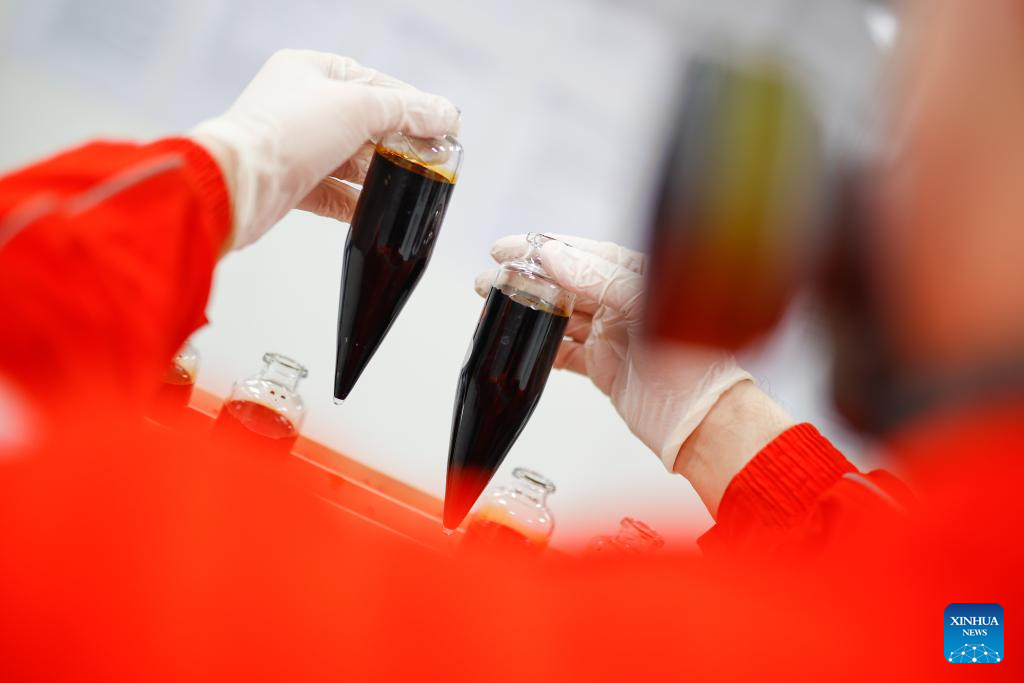A worker tests crude oil sample at an offshore production platform of the first phase of Bozhong 26-6 oilfield in China's Bohai Sea, Feb. 8, 2025. The first phase of Bozhong 26-6 oilfield, by far the largest metamorphic rock oilfield in the world, commenced production on Friday, according to its developer, the China National Offshore Oil Corporation (CNOOC) Tianjin branch.