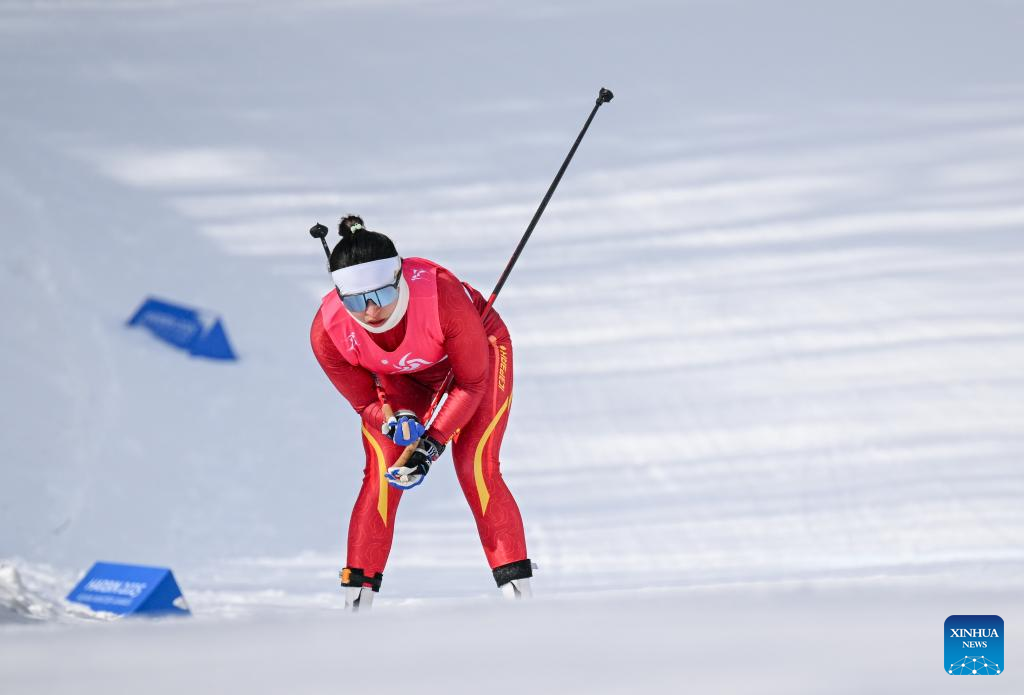 Dinigeer Yilamujiang of China competes during the women's sprint classic qualification match of the cross-country skiing event at the 9th Asian Winter Games in Yabuli, northeast China's Heilongjiang Province, Feb. 8, 2025. (Xinhua/Lian Zhen)