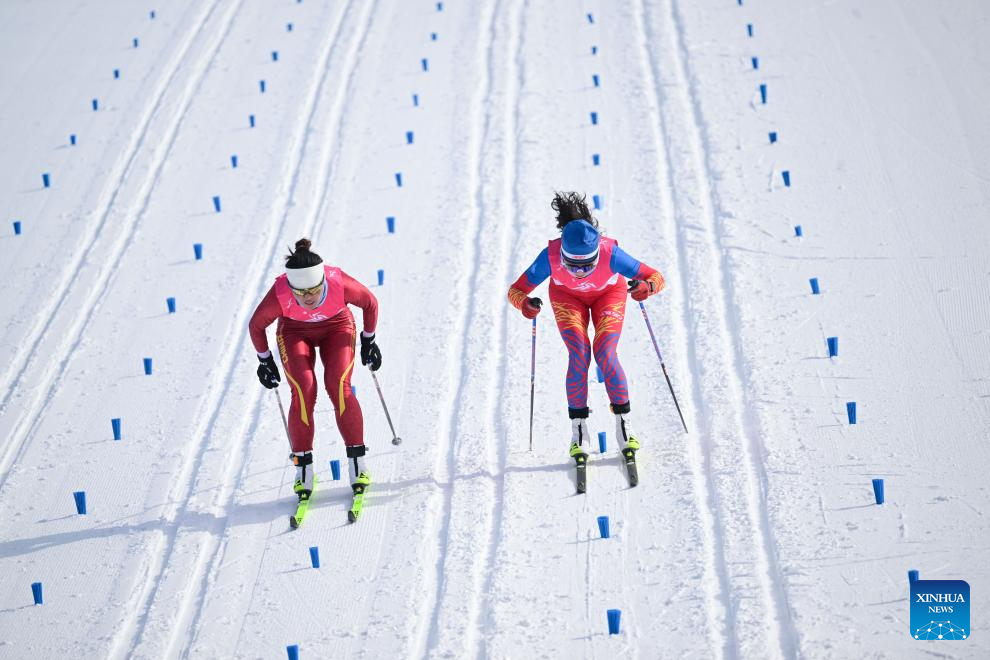 Chen Lingshuang (L) of China competes during the women's sprint classic qualification match of the cross-country skiing event at the 9th Asian Winter Games in Yabuli, northeast China's Heilongjiang Province, Feb. 8, 2025. (Xinhua/Zhang Long)