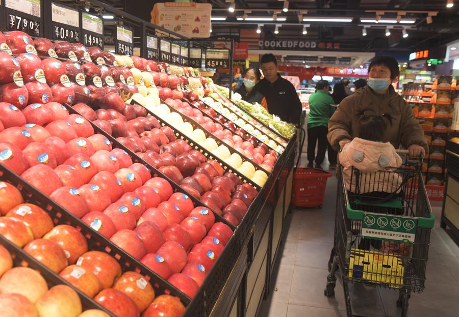 Customers select fruit at a supermarket in Xinle, north China's Hebei Province, Jan. 9, 2025. (Photo by Jia Minjie/Xinhua)